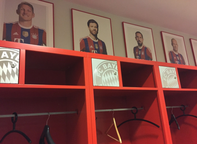 今年夏加入のシャビ・アロンソはシュヴァインシュタイガーとリベリーの間のスペースを使っています。誰のスペースか分かりやすいように写真がブースの上についています。