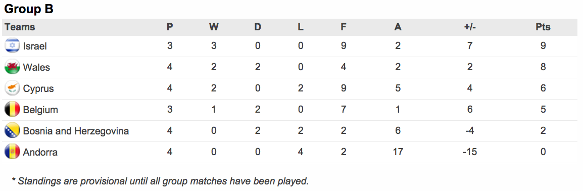 一方、ベルギー対ウェールズが0-0で引き分けたため、首位に立ったのはこの試合を制したイスラエルである。イスラエルは他のチームに比べて消化試合が1試合少ないが予選開幕以来3連勝を記録しており、破竹の快進撃を見せている。