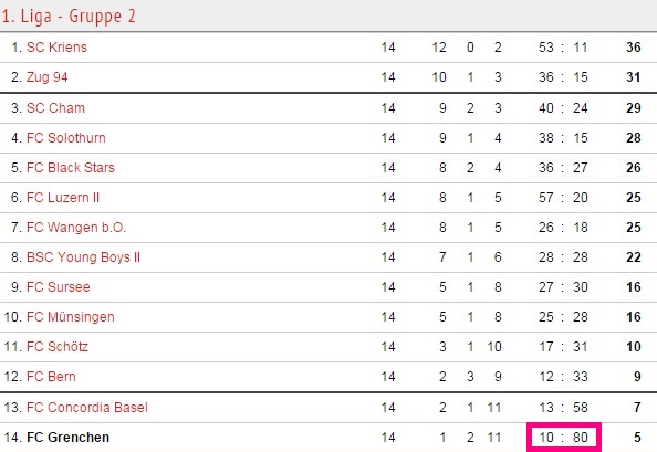 — azSolothurnerZeitung (@azSolothurn) 2014, 11月 194部(グループ2)で、リーグ14節を終えてわずか1勝、得失点差マイナス70(得点10に対し失点は80)で最下位に沈むグレンヘン。直近のルツェルンII戦では0-10の惨敗を喫し、これでリーグ戦9連敗となってしまった。