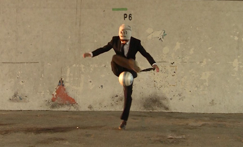 3.で放り上げたボールを、足首を伸ばしてインステップ面を下に向け、思い切り地面に叩き付けます。