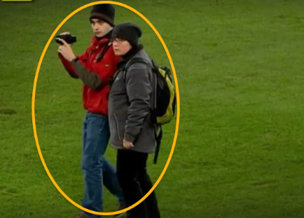 小型カメラ、通称ハンディカムだ。ユニフォームを着てイタズラするわけでもなく、政治的メッセージを掲示するわけでもなく、この2人組はただただ穏やかにハンディカムを回していた。警備スタッフが駆け寄っても決して抵抗せず、素直に指示に従っている。ここまでくると逆にシュールである。
