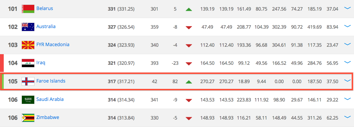 その時の成績が大きく加算され、フェロー諸島は先月の順位から82位もジャンプアップし105位につけ、ベラルーシやオーストラリア、マケドニアやイラクに肉薄している。