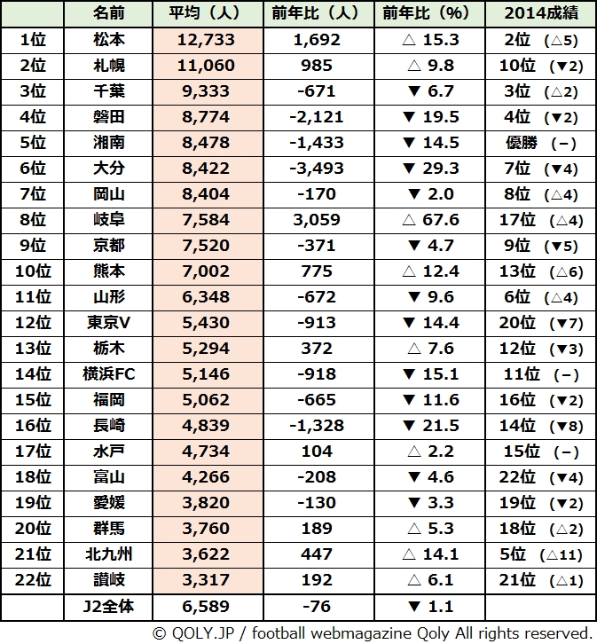 まず、J2全体としての入場者数は2013シーズンと比べ、1.1%のマイナス。増加したチームが9、減少したチームが13となった。
