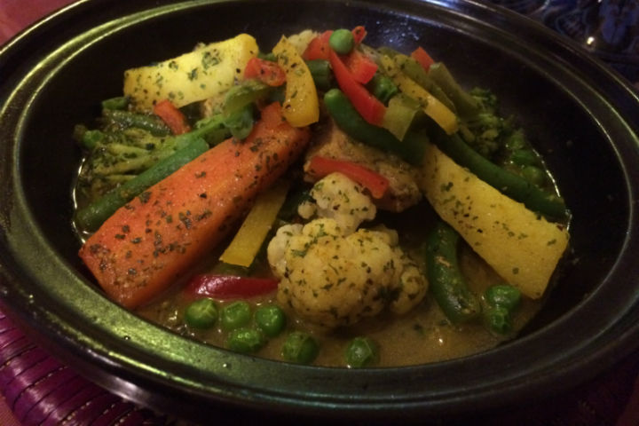 最後に訪れたのはモロッコの代表的料理であるタジン鍋を名前に関したタジンやだ。伝統的なベルベル人の衣装に身を包んだモロッコ人シェフが伝統的なモロッコ料理を食べさせてくれる。こちらでは、メニューからタジン鍋を選択した。蒸し料理であるタジンは、近年の日本でもダイエット食として流行した。その時は、筆者もタジン鍋を購入して自作してみたのだが、そのまま蒸しただけでは味がなく飽きてしまい中年体型にすぐ戻ってしまった。だが、こちらのタジン鍋はスパイスが効いており、野菜中心のメニューであっても男性にもオススメできる味付けとなっていた。
