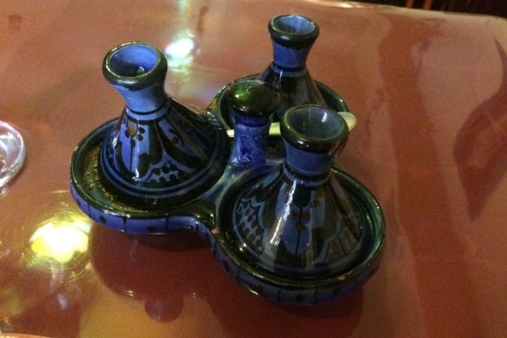 卓上には小さなタジン鍋が。こちらは塩、故障、スパイス(クミンと思われる)の3種類が入っており、味付けを調整できる。