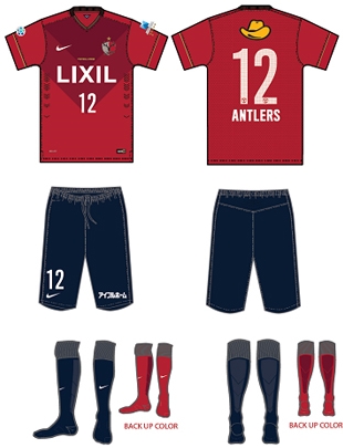 ホーム(1st)は、県花のバラの色に由来するクラブカラーのディープレッドのシャツに、鹿島灘・霞ヶ浦・利根川など豊富な水資源を表す紺のパンツという伝統的なコーディネートを継承。3色の赤を用いたスピード感のあるデザインディテールには、Nikeの2014-15モデルらしい特徴が伺える。(同じく赤を基調にした リールの2014-15ホームの逆パターンに近いだろうか)