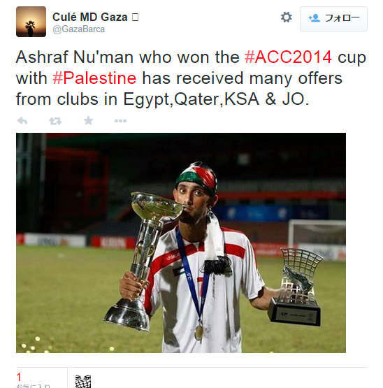 どうしても実戦の機会が少なく、上位との対戦が多いパレスチナ。その中で48試合14ゴールという記録を残しているのが現在の絶対的エース、アシュラフ・ヌーマンである。