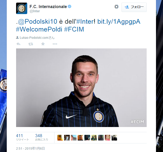 1月5日、イタリア・セリエAのインテルは「アーセナルからドイツ代表FWルーカス・ポドルスキを獲得した」と公式発表した。