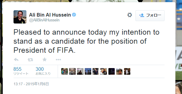 1月5日、『L'Equipe』は「ヨルダンの王子アリ・ビン・アル・フサイン氏がFIFA会長選挙に立候補することを表明した」と報じた。