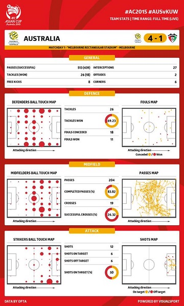 こちらは試合終了直後にAFCがリリースしたオーストラリア代表のスタッツ。パス成功数タックルの数などが網羅されており、"Match Centre"では22選手+交代選手のヒートマップなどのデータも掲載。