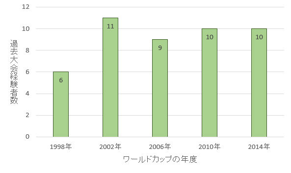 アギーレが率いた2002年、2010年は若干ではあるが過去の大会経験者数が他の年度よりも多くなった。