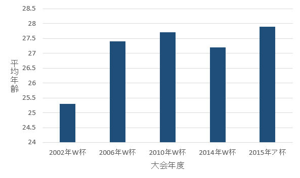 過去の大会では「 【特集】ワールドカップ日本代表戦士たちのいま」によると2006年ワールドカップが27.4歳、2010年ワールドカップが27.7歳。2014年ワールドカップでも「最年少は一体どこ?W杯出場国の平均年齢が明らかに...日本代表は15番目の若さ」によると27歳と84日(27.23歳)となっている。