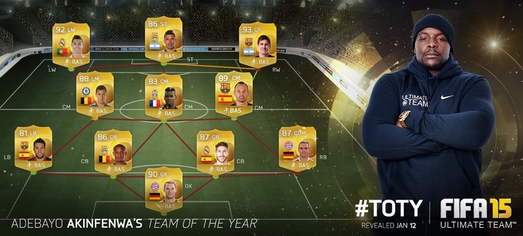 サッカーゲーム『FIFA15』でもSTRENGTHという能力値がNo.1に設定されており、“Strongest player in FIFA"(EA Sports公式より)≒最強FWとしても知られている。 そんなアキンフェンワが『FIFA15』の企画で、ベストイレブン(TEAM OF THE YEAR)をセレクトしていたので紹介。