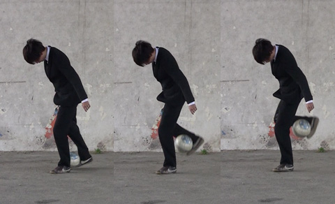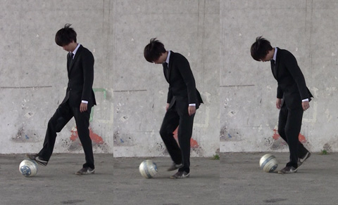 ボールが爪先に乗ったに瞬間に、右足の膝を曲げインサイドで持ち上げます。