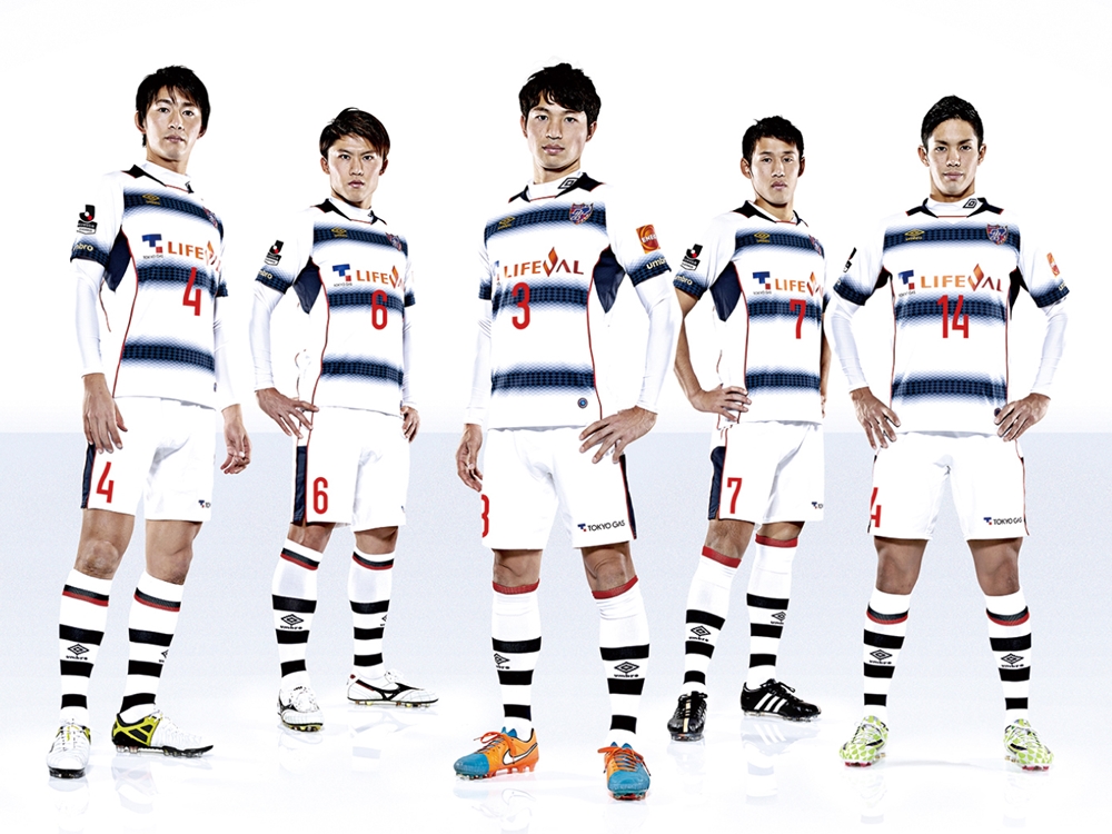 左から、高橋秀人、太田宏介、森重真人、米本拓司、武藤嘉紀。ホーム発表時は一番右に立っていた権田修一が外れていることから、GKモデルはすべてホームと同じストライプ柄のテンプレートなのかもしれない。