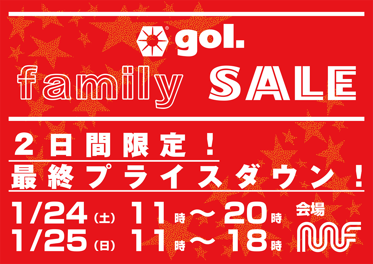 原宿のカフェ「mf」にて1/24(土)、25(日)の2日間限定で、gol.のファミリーセールが開催されます。