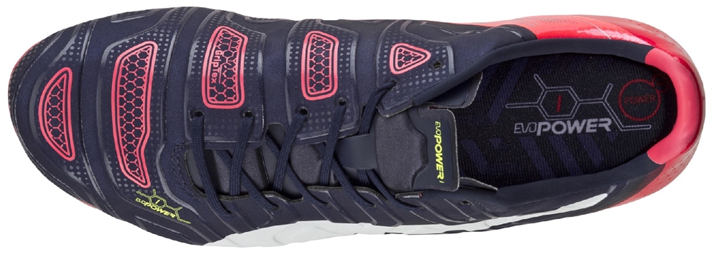 「エヴォパワー」の特徴の一つである、足馴染みの良い特殊なパッド「アキュフォーム」を今回、キッキングエリアだけでなくインサイド・アウトサイドを含む紫のアッパー部分全体に搭載し、正確かつパワフルなキックをサポート。