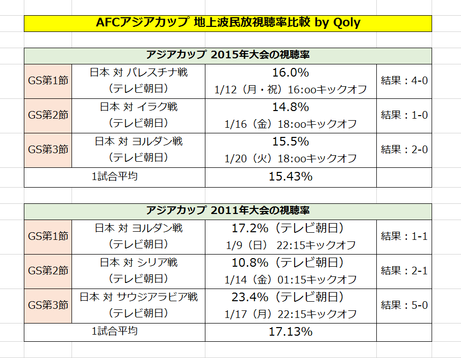 こちらが、前回大会と今大会の視聴率を比べたものだ。