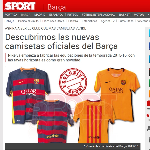 先月、2015-16モデルのデザインをリークした地元カタルーニャの『Sport』が、新たにその実物画像を公開。クラブ史上初となるボーダー柄の新ユニフォームが紹介されている。やはり、これのようだ。