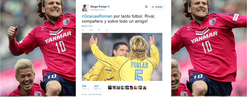 セレッソ大阪に所属するFWディエゴ・フォルランが、現役引退を発表したフアン・ロマン・リケルメに向けたコメントを送っている。