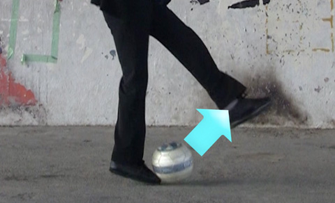 するとボールは前方へと飛び上がります(その為、2.で足を重心より後ろに降ろす必要があったのです)。