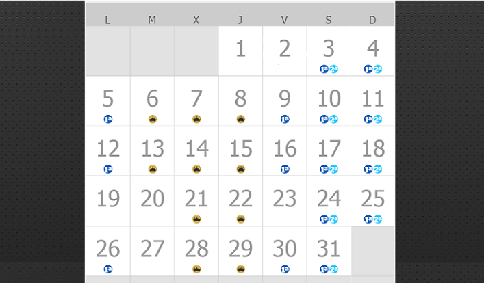 日付けの下に濃い青丸が描かれているのが1部の試合開催日、薄い青丸が描かれているのが2部の試合開催日、そして黄色の丸印が描かれているのがコパ・デル・レイの開催日だ。