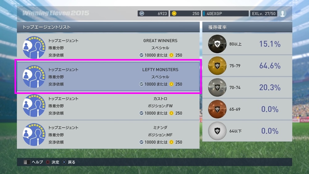 エージェントリストで『レフティーモンスターズ (LEFTY MONSTERS)』を選択すると、右に獲得確率が表示。