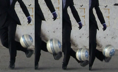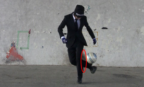 親指の第一関節あたりまで上がったら、ガニ股のような状態でインサイドを上に向けてボールを持ち上げるようにして空中に放り上げましょう。