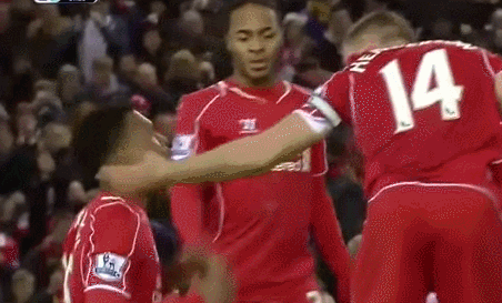 ゴールを決めたスターリッジのもとに駆けつけたスターリング。が、タイミングが一歩遅くスターリッジは天にお祈りポーズ中。なんとも微妙な間が流れている。画像で見るとこんな流れ。