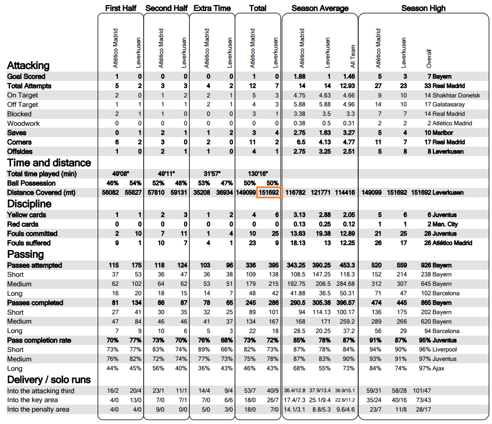 "Distance Covered"、つまりこの試合での走行距離を示す値なのだが、アトレティコ側で149.099km、レヴァークーゼン側で151.692kmとなっている。