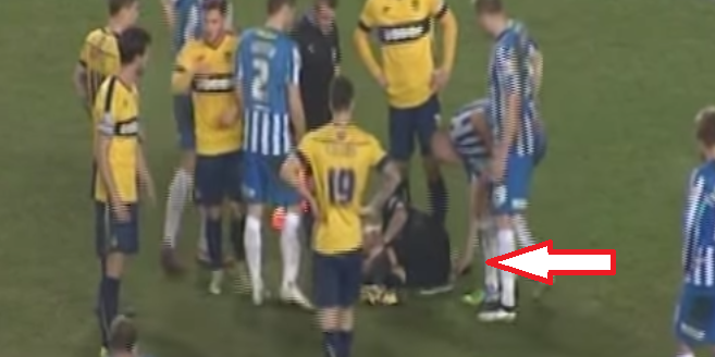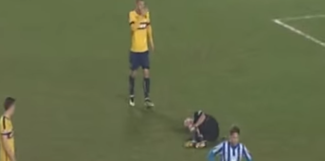 おそらくおどけてやったのだろうが、負傷の程度は思いのほか悪くミラー主審はストレッチャーでピッチの外へと運び出された後、救急車で病院へと搬送されている。ヒザの負傷が疑われているとのこと。