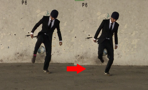 膝を伸ばしてはね飛ばしたボールを、素早く膝を曲げてボールをカカトで下から蹴り上げます。