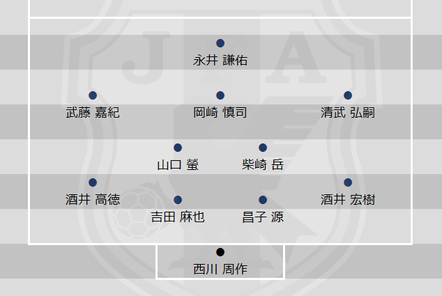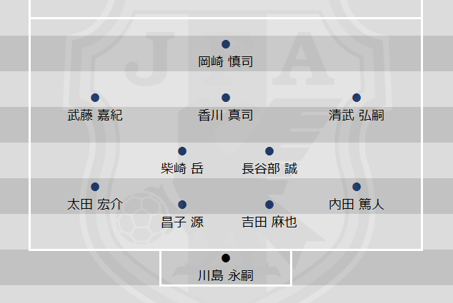 コメント:スペース感覚に優れた岡崎と香川の縦関係を軸にしてもらいたい。出し手として清武に期待し、本田は控えスタート。センターバックは昌子のDFとしての能力を買う。キッカーは右の清武、左の太田。