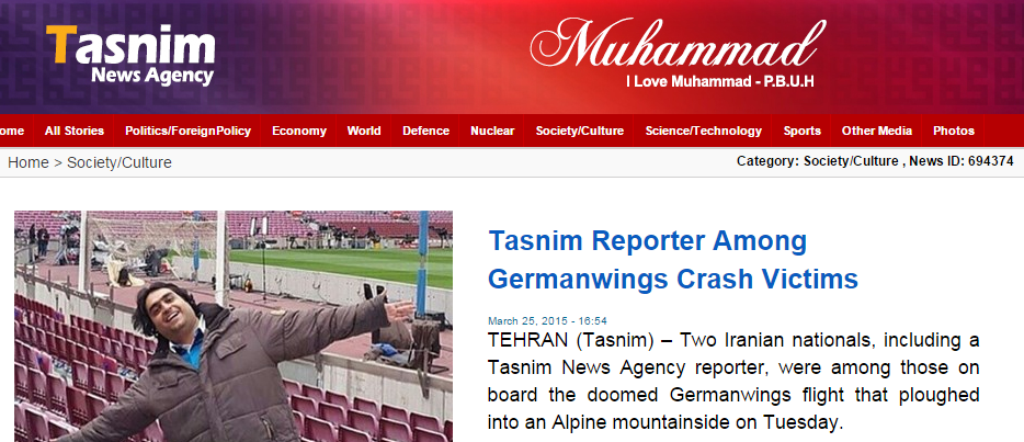 実際に「tasnimnews.com」英語版でも「イラン外務省はTasnim News Agencyのスポーツ通信員であるMilad Hojjatoleslami、Vatan-e Emruz DailyのリポーターであるHossein Javadiが事故の犠牲者に含まれていることを確認した」と報じている。2人は現地日曜日に行われたバルセロナとレアル・マドリーの試合を取材するためバルセロナを訪問、その後イラン代表の親善試合(オーストリアでのチリ戦、ストックホルムでのスウェーデン戦)を取材するためにバルセロナを発ったという。ベルリンにあるイラン大使館も2人が同機に搭乗していたことを確認したとも伝えている。