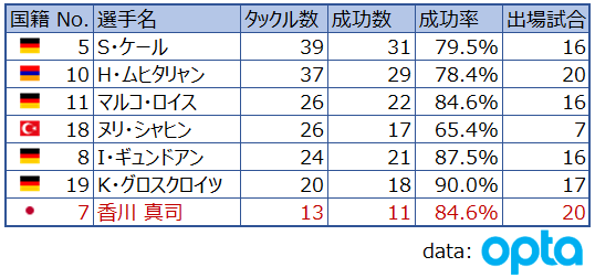 チェルシーとドルトムントのスタイルの違いはあるが、前線からプレスを仕掛けていくチェルシーよりもドルトムントの方が今季のタックル数は多く欧州で18位となっている。香川がチームスタイルからタックルをしてないわけではない。