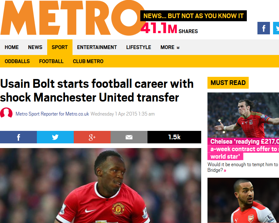 Metro:Usain Bolt starts football career with shock Manchester United transfer