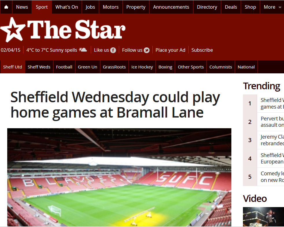 シェフィールド・ウェンズデイが宿敵シェフィールド・ユナイテッドのホーム、ブラモール・レーンを使用すると伝えた地元の『Sheffield Star』。