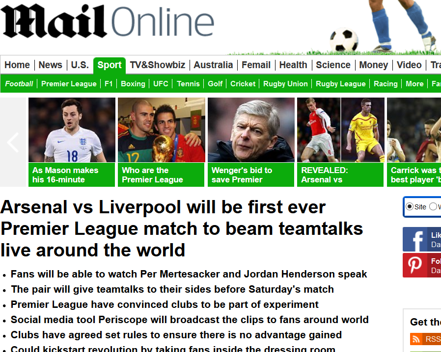 Daily Mail:Arsenal vs Liverpool will be first ever Premier League match to beam teamtalks live around the world