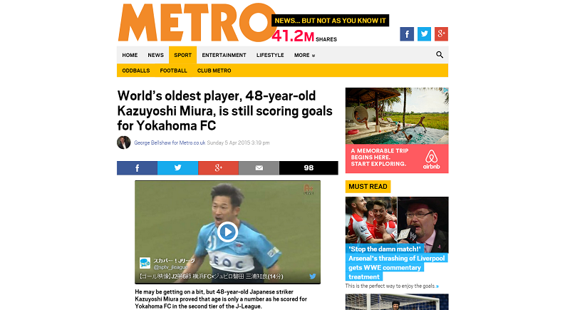 『Metro』はカズを、「世界最年長選手」と形容した。