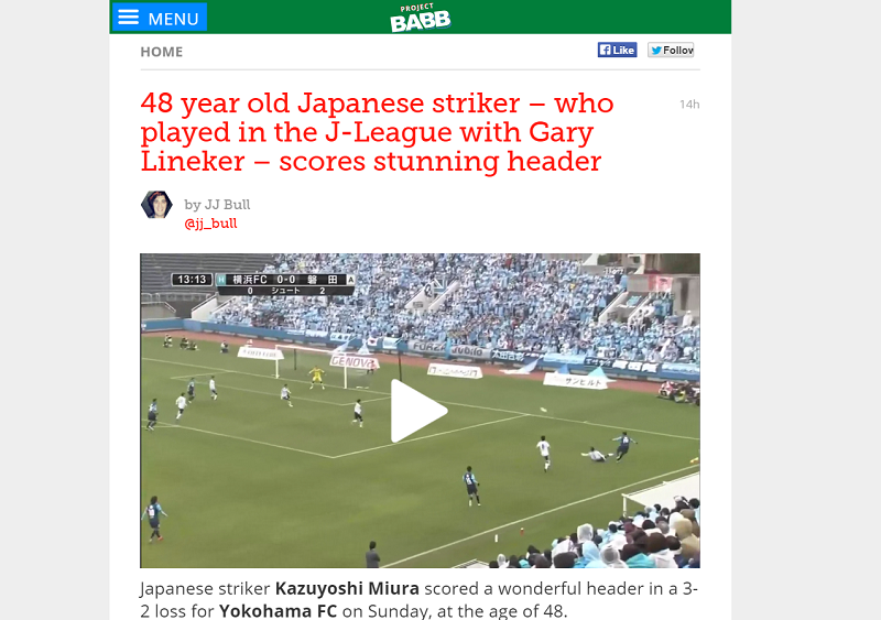 『Telegraph』が展開する『Project Babb』では、カズを「Jリーグでギャリー・リネカーと一緒にプレーした選手」と紹介。