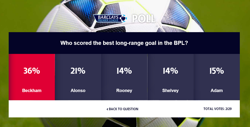 プレミアリーグの公式サイトでは、以上5ゴールの中で「最優秀ロングシュートはどれ?」という投票企画を行っており、6日18時現在の投票結果はこうなっている。