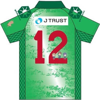 背面には畑耕作、木下林檎、中沢農という3人のキャラクターがサポーター番号である12にかわいくプリントされている。左袖に見えるのは若旦那という名のワラビーだ。