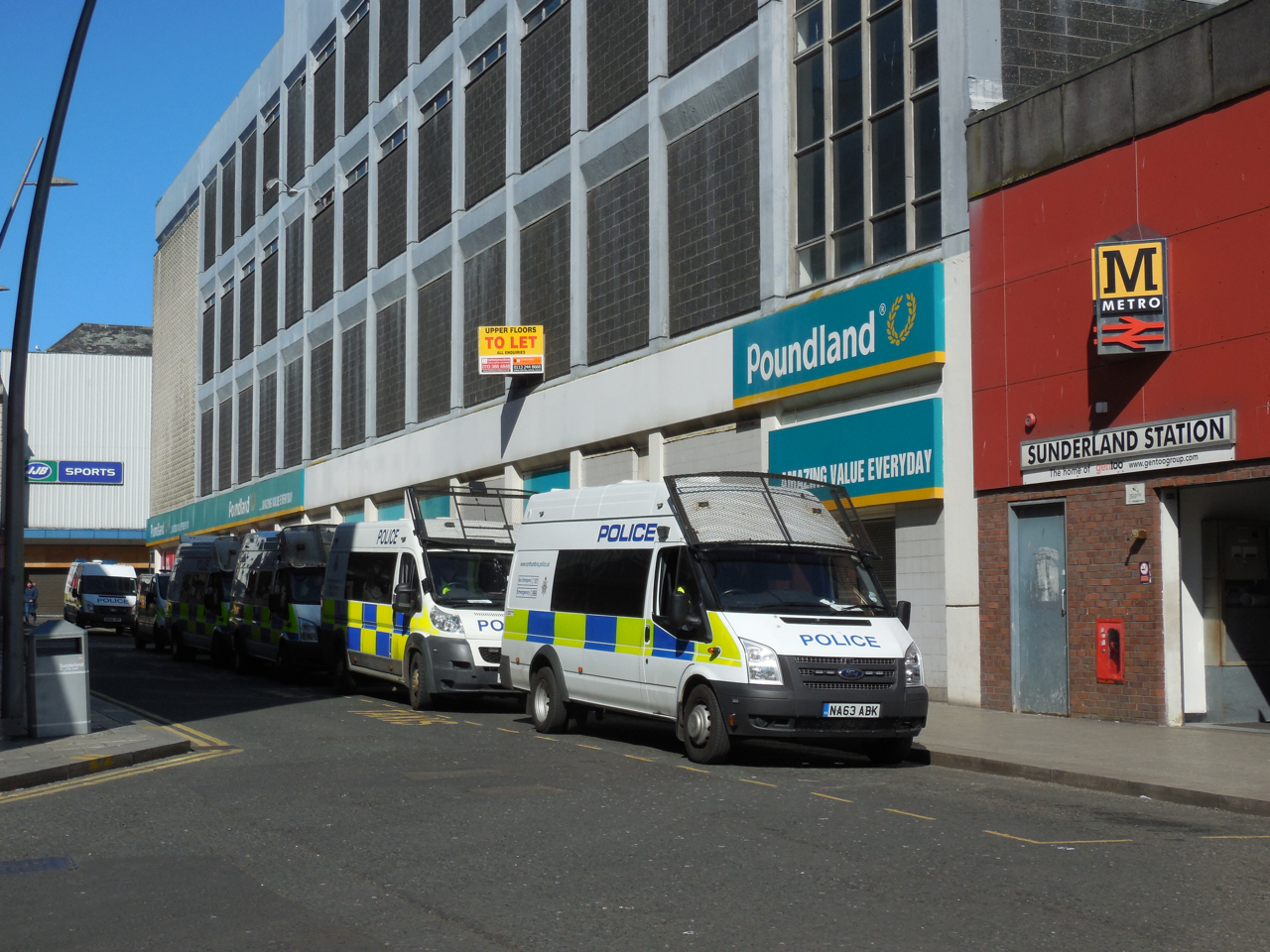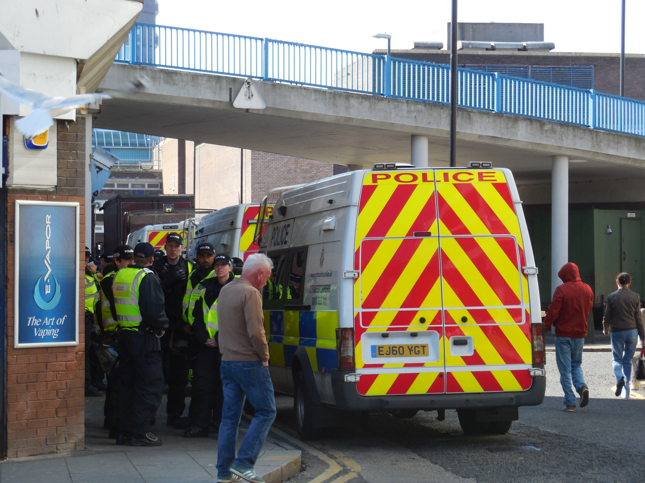 最凶のダービー。タインウェアダービーにおける1つの特徴は、サポーター同士の争いを防ぐ為の厳重警備であろう。中心街に向かう途中で、警察車両の大群が路地裏へと入っていく所を見た。次の写真が、駐車されていた警察車両だ。その列の先頭に向かうと、メトロステーションの入口。その横では、警察官たちがなにやら神妙な面持ちで会話している。警察官が持つ無線は、ひっきりなしに他のエリアの状況を知らせているようだった。