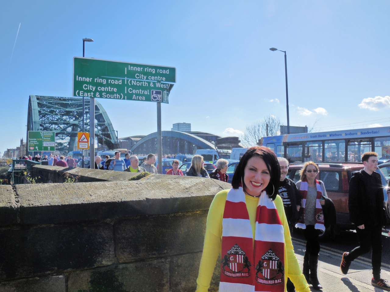 しばらくすると、到着したニューカッスルサポーターの群れは、駅前から姿を消した。混雑する通りの様子を写真に収めていると、1組のカップルに「写真を撮ってくれ」と声をかけられた。二人でダービーの観戦に訪れた際は、必ず撮っているのだと言う。男性から「ニューカッスルの奴ら、もう来たか?」と問われたので、「数分後には別のグループが来るのでは」と答えた。彼はどうしても、アウェイサポーターの彼らの到着を待ち受けたいと言う。