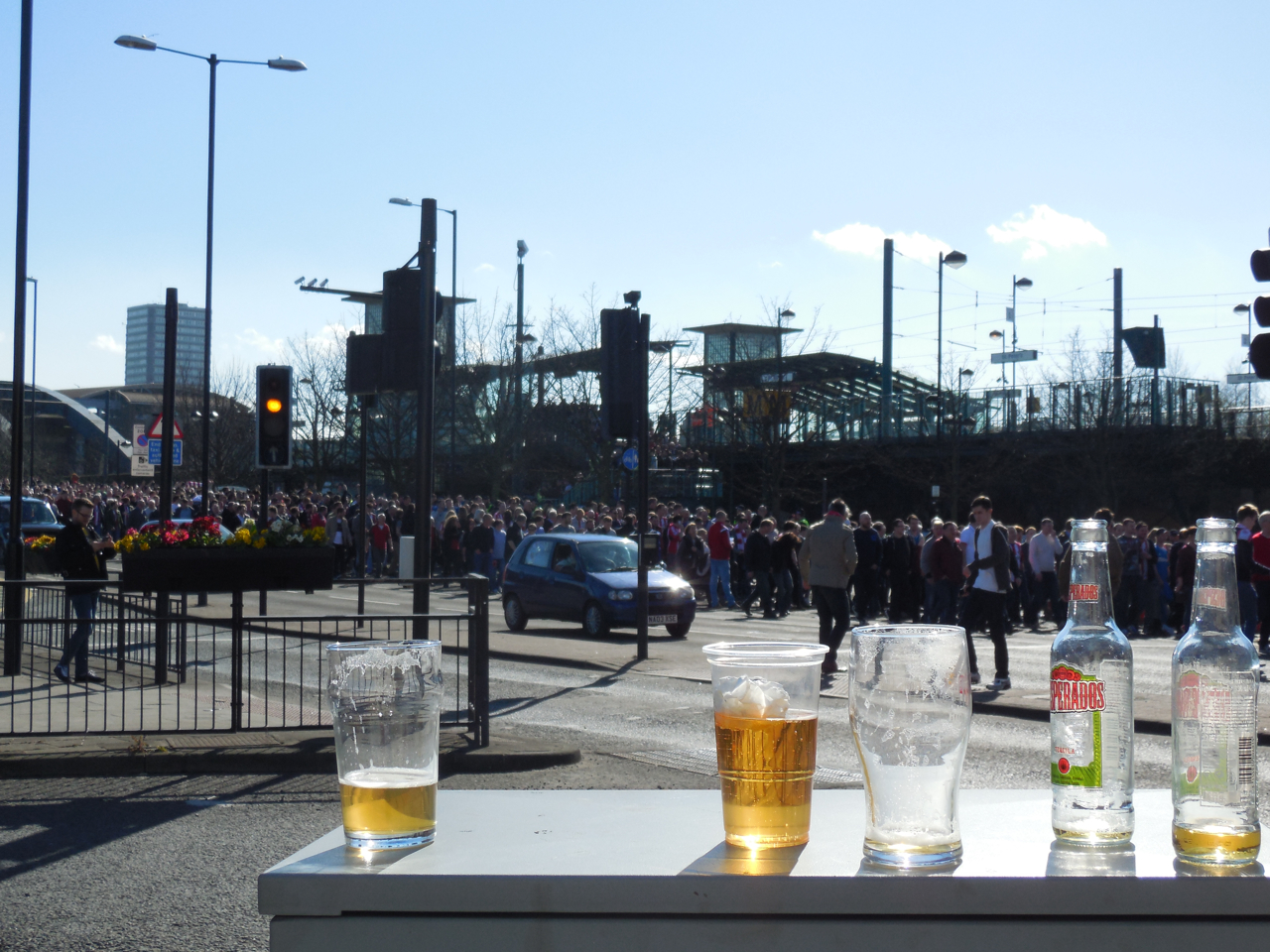 彼らと別れ、一足先にスタジアムへと向かう。飲みかけのビールのグラスと瓶が、至る所に放置されていた。鼻をつくようなアルコールの臭いが、ずっと付きまとう。決戦の地へ向かうほろ酔い気分の集団のボルテージは、否応無しに高まっていく。