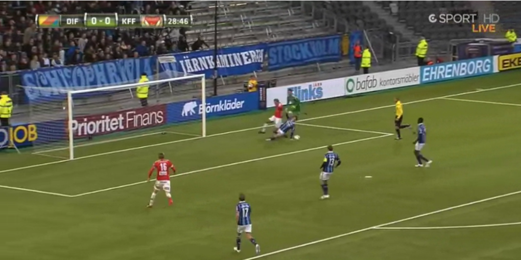 しかし、ここで見事な対応を見せたのがDFイェスパー・アルヴィドソンだった。既に前方を見ていた味方もいた状況において、いち早く失点の危機を察知したアルヴィドソンは、素晴らしいスピードでカバーに入ってタックル!