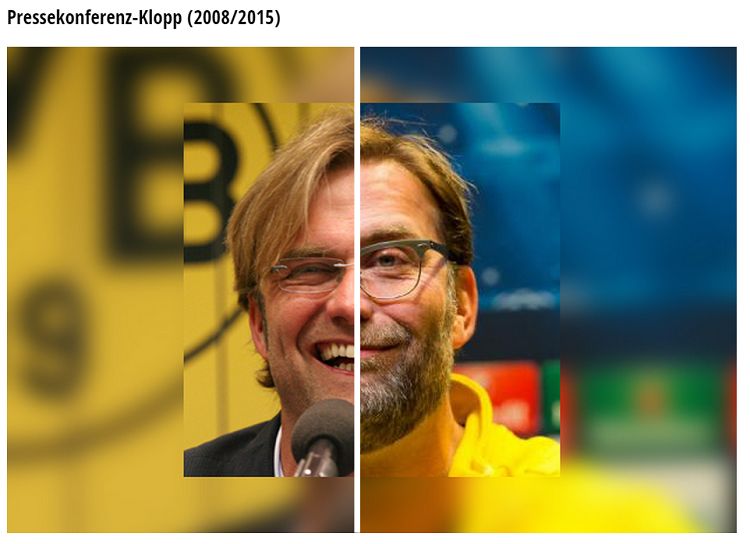 左半分が2008年当時のもので、右半分が2014年当時の表情である。真ん中の白いラインは自由にスクロールでき、これを動かすことでクロップ監督の顔が時間の経過によってどのように変化したかを楽しむものだ。