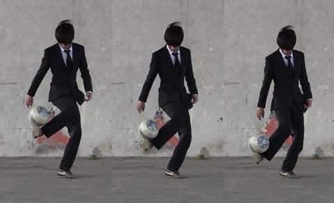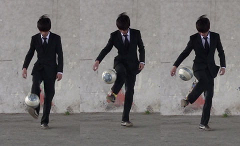 膝を立てて、足の甲も同時に上を向けてボールが落ちないように、インステップで放り上げましょう。