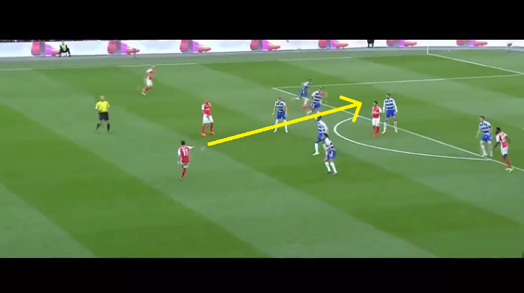 「一般的な人は黒の矢印のパスコースしか見えないけれど、エジルには赤い矢印のパスコースが見える」といったものである。このアングルから見ると、レディングの「組織」をエジルという「個」が完全に打開したことがよく分かる。