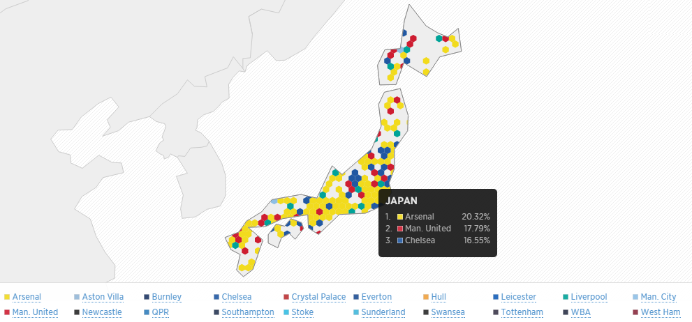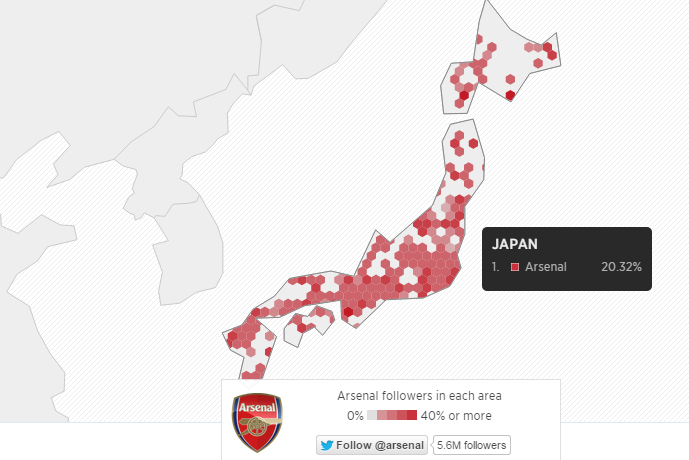 数値的には、日本におけるプレミアリーグ20クラブのフォロワーのうち20.32%がアーセナルのフォロワーで、その次がマンチェスター・ユナイテッドの17.79%、そしてチェルシーが16.55%で続いているそうだ。イングランドのマップでは都市ごとの“支配率"を見ることもできるが、日本は各都市ごとのデータはなく国全体での数値だけのようだ。